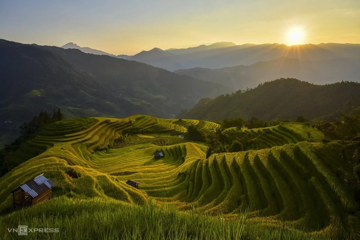 Hoang Su Phi se pone su vestido más suntuoso. Los terrazos que se curvan en las laderas parecen cintas de oro suaves que se extienden hasta el horizonte. Por la mañana, cuando la niebla se disuelve, el sol ilumina las espigas llenas, que brillan como si estuvieran bañadas en oro. El crepúsculo, con la luz color miel que se posa en los campos, unido al aroma de la paja y el humo de los hogares, crea una atmósfera inolvidable.
