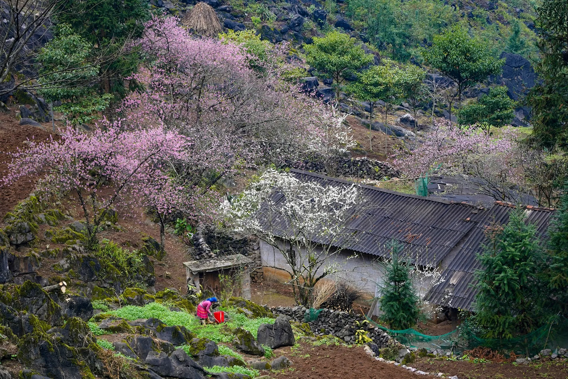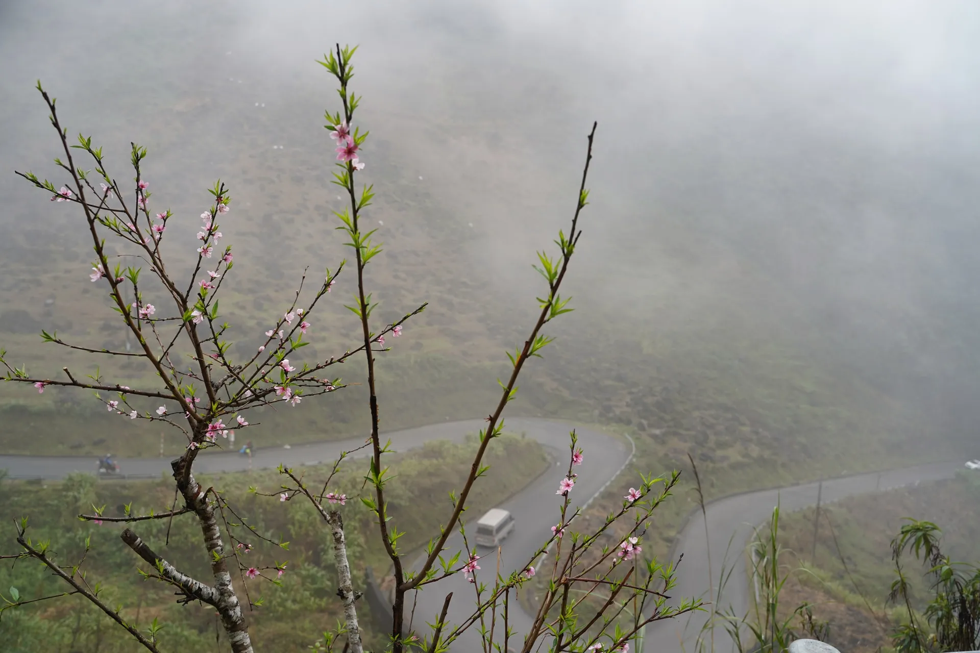 Finales de Diciembre – Enero: El Despertar. Verá el primer rubor de los majestuosos melocotones silvestres (đào rừng) comenzando a florecer, a menudo acompañado por el blanco puro de las flores de ciruelo (hoa mận), creando un paisaje de rosa y blanco entrelazado con la niebla de la montaña.